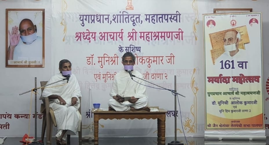 मुनिश्री डॉ. आलोक कुमार जी ठाणा-2 के पावन सान्निध्य में श्री जैन श्वेताम्बर तेरापंथी सभा, पालघर द्वारा 161वें मर्यादा महोत्सव का आयोजन 2 फरवरी, 2025 को तेरापंथ भवन में आयोजित हुआ। अनुशासन रैली द्वारा पूरे शहर में नारों के साथ गुंजायमान करते हुए मुनिवृंद का मर्यादा महोत्सव कार्यक्रम हेतु तेरापंथ भवन में मंगल प्रवेश हुआ। मुनिश्री डॉ. आलोक कुमार जी द्वारा नमस्कार महामंत्र एवं भीखण जी स्वामी भारी मर्यादा बांधी संघ ने इस गीत का संगान कर कार्यक्रम का विधिवत प्रारम्भ किया। मंगलाचरण ज्ञानशाला प्रशिक्षिकाओं द्वारा किया गया।